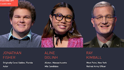 On Jeopardy last night (via the YES TV - the Mississauga-area based channel which shows reruns on the week-ends), there was a contestant who had a strange grin and who would shake her head every time she got to answer an "answer," which thankfully wasn't often.